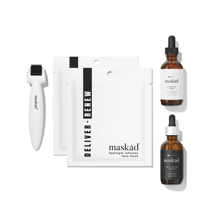 Unleash your youthful glow in just 20 minutes, 2-3 nights a week with the Maskād® Routine! This complete system complements your existing skincare, leaving you with hydrated, beautiful skin. The gentle formulas (perfect for all ages and skin types!) include a Hydrating Serum, Anti-Aging Serum, Derma Roller, and Hydrogel Face Masks – a powerful combination to minimize fine lines, reduce imperfections, and reveal a bright, smooth complexion.